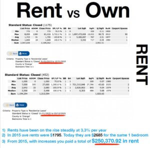 The above example was a decision a person could have made, and the end result is after 10 years as of this very month the two paths equals very different results. The renter spent $250,370.92 in rent assuming they stayed in the same 1 bedroom place and it went up with the same averages of rental increase that all of the OC experienced